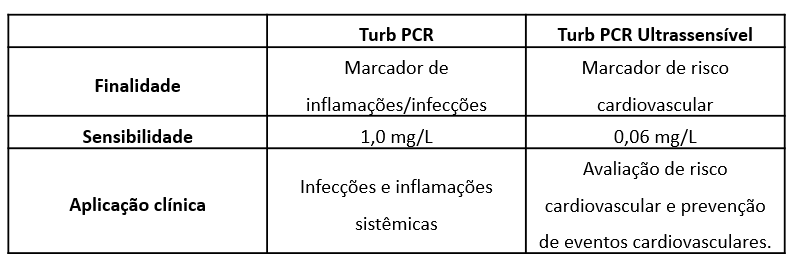 O Turb PCR é um marcador inflamatório e infeccioso, utilizado principalmente para indicar e acompanhar infecções e inflamações sistêmicas. Já o Turb PCR Ultrassensível é desenvolvido para detectar níveis muito baixos de PCR, sendo indicado na avaliação e monitoramento do risco cardiovascular, mesmo na ausência de sintomas inflamatórios evidentes.